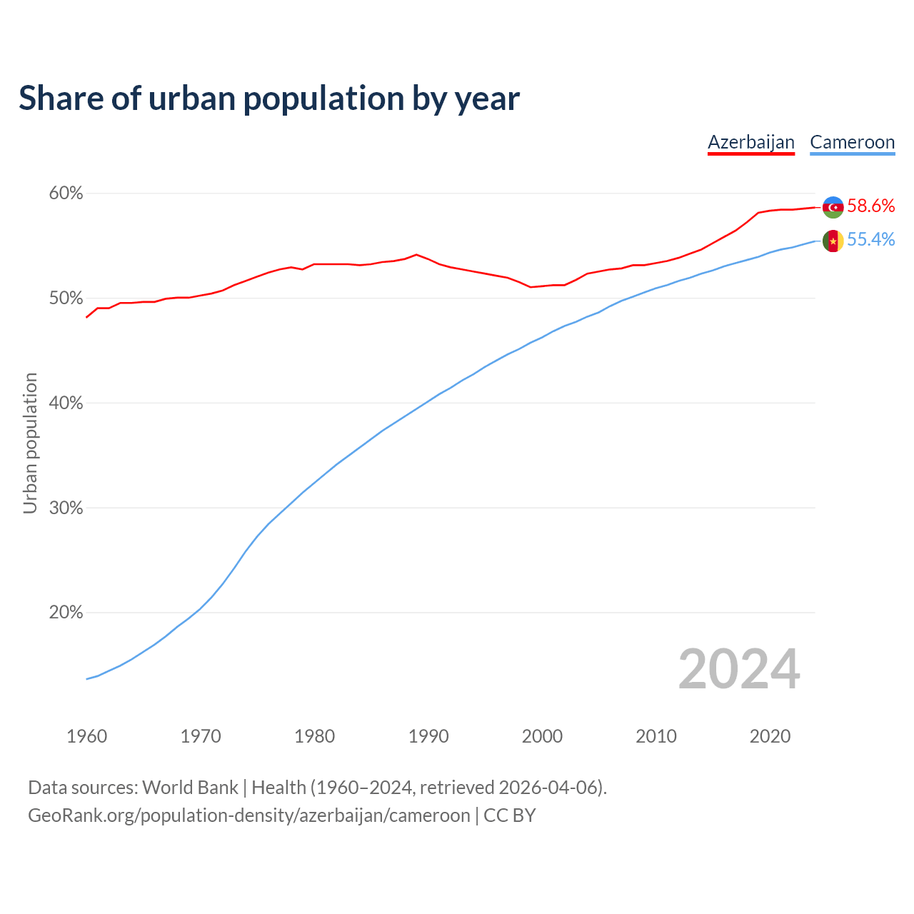 From 2004 to 2024, the share of urban population changed from 52.3% to 58.6% in Azerbaijan and from 48.2% to 55.4% in Cameroon.
