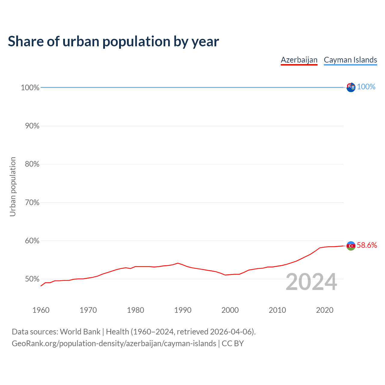 From 2004 to 2024, the share of urban population changed from 52.3% to 58.6% in Azerbaijan and from 100% to 100% in the Cayman Islands.