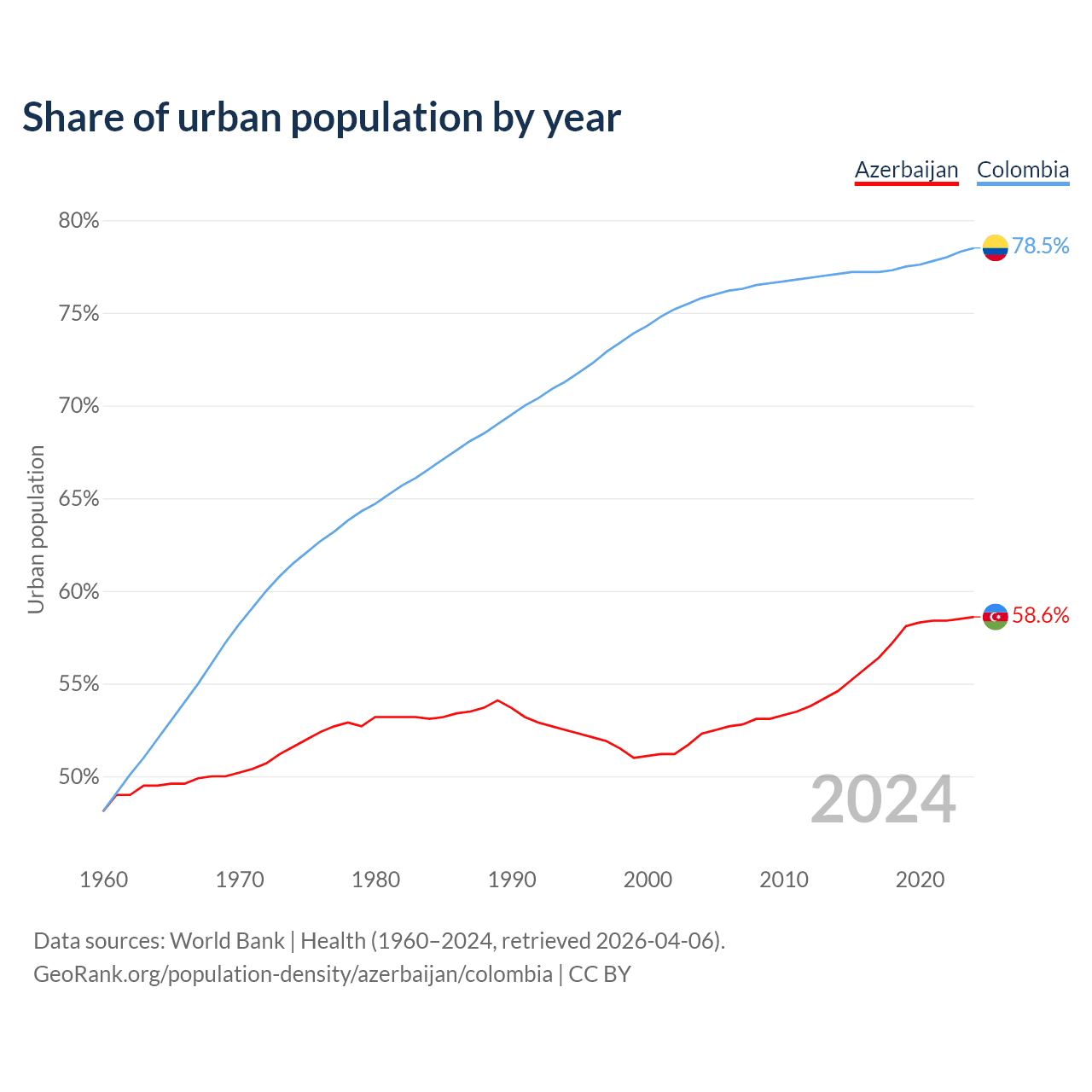 From 2004 to 2024, the share of urban population changed from 52.3% to 58.6% in Azerbaijan and from 75.8% to 78.5% in Colombia.
