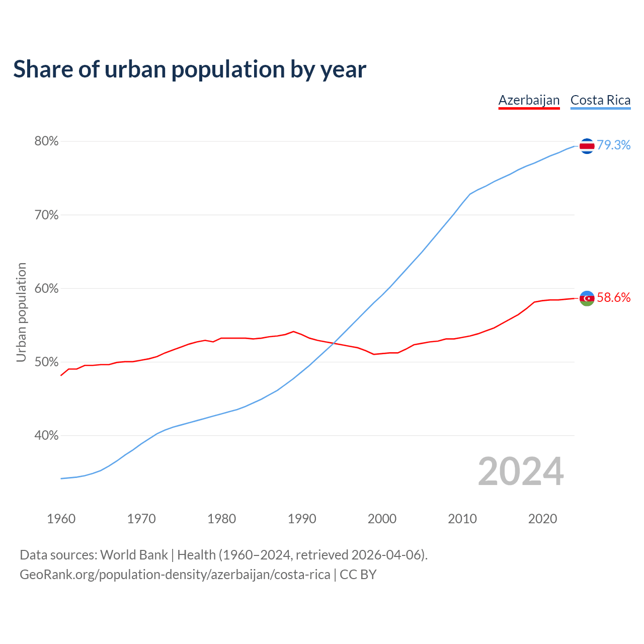 From 2004 to 2024, the share of urban population changed from 52.3% to 58.6% in Azerbaijan and from 63.7% to 79.3% in Costa Rica.