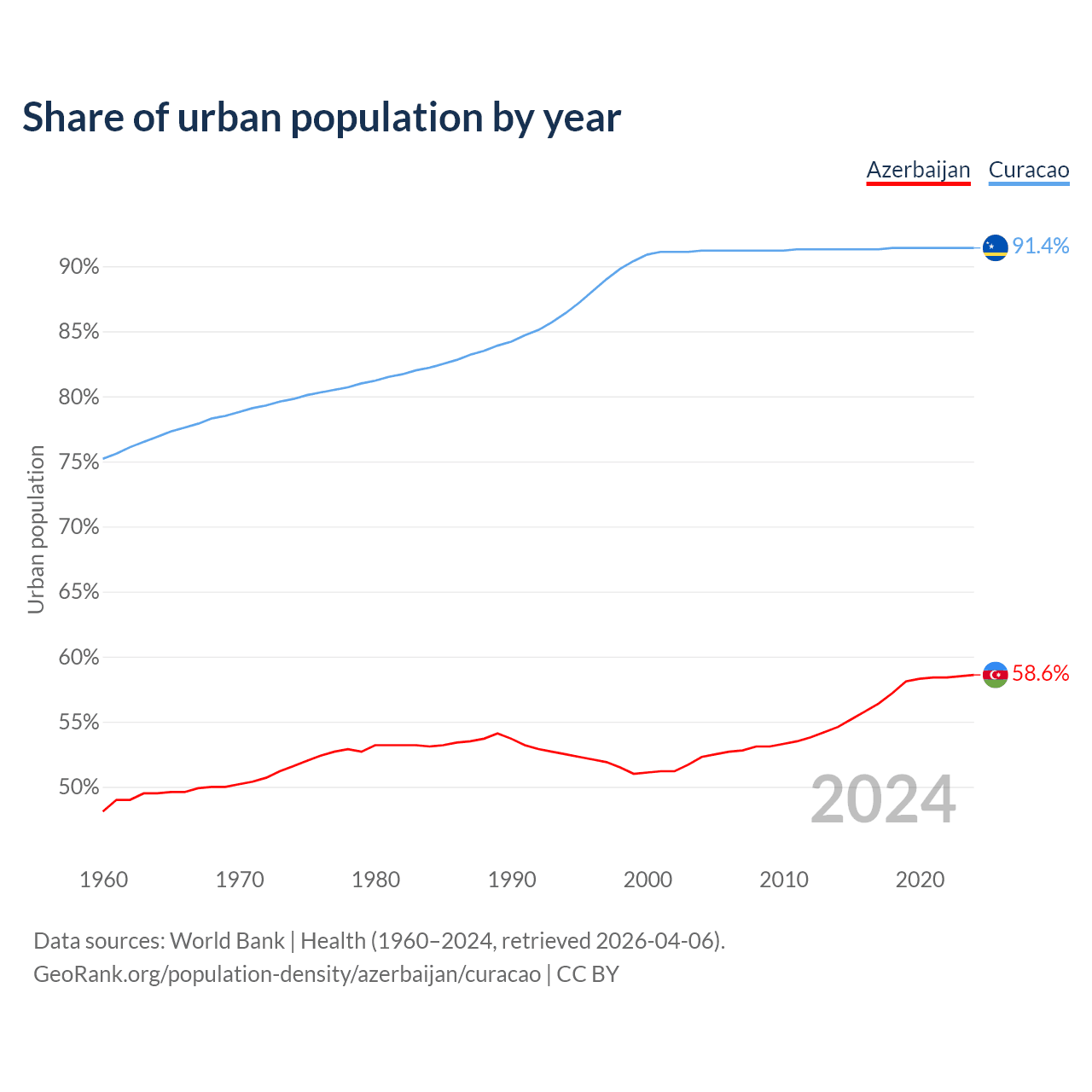 From 2004 to 2024, the share of urban population changed from 52.3% to 58.6% in Azerbaijan and from 91.2% to 91.4% in Curacao.