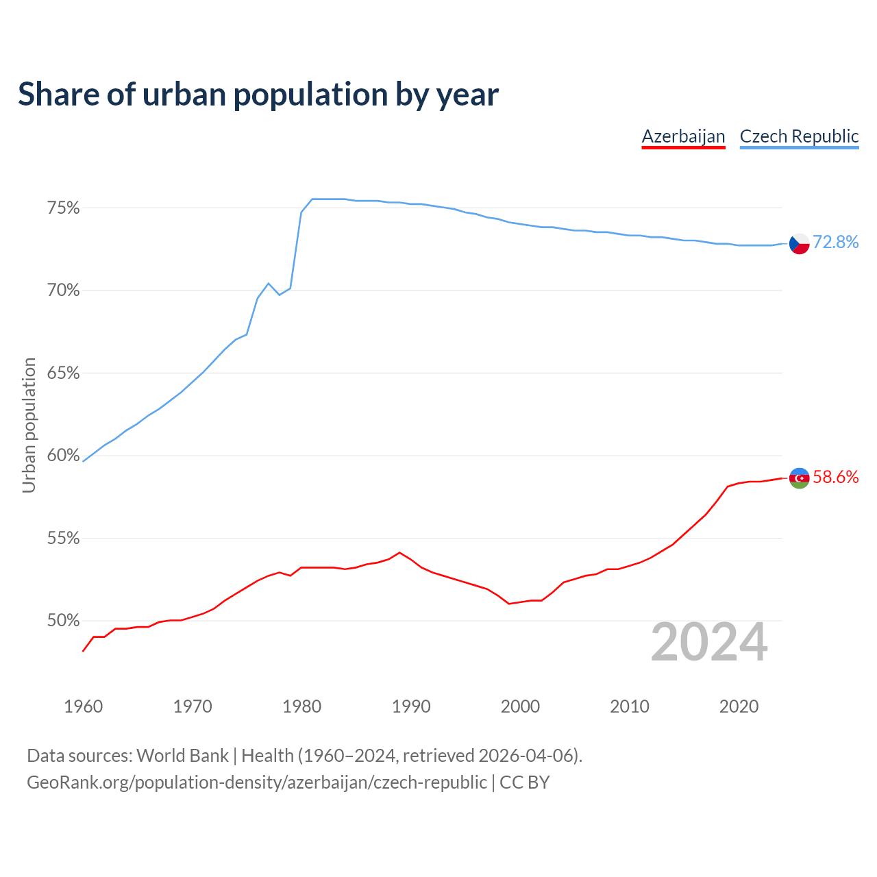 From 2004 to 2024, the share of urban population changed from 52.3% to 58.6% in Azerbaijan and from 73.7% to 72.8% in the Czech Republic.