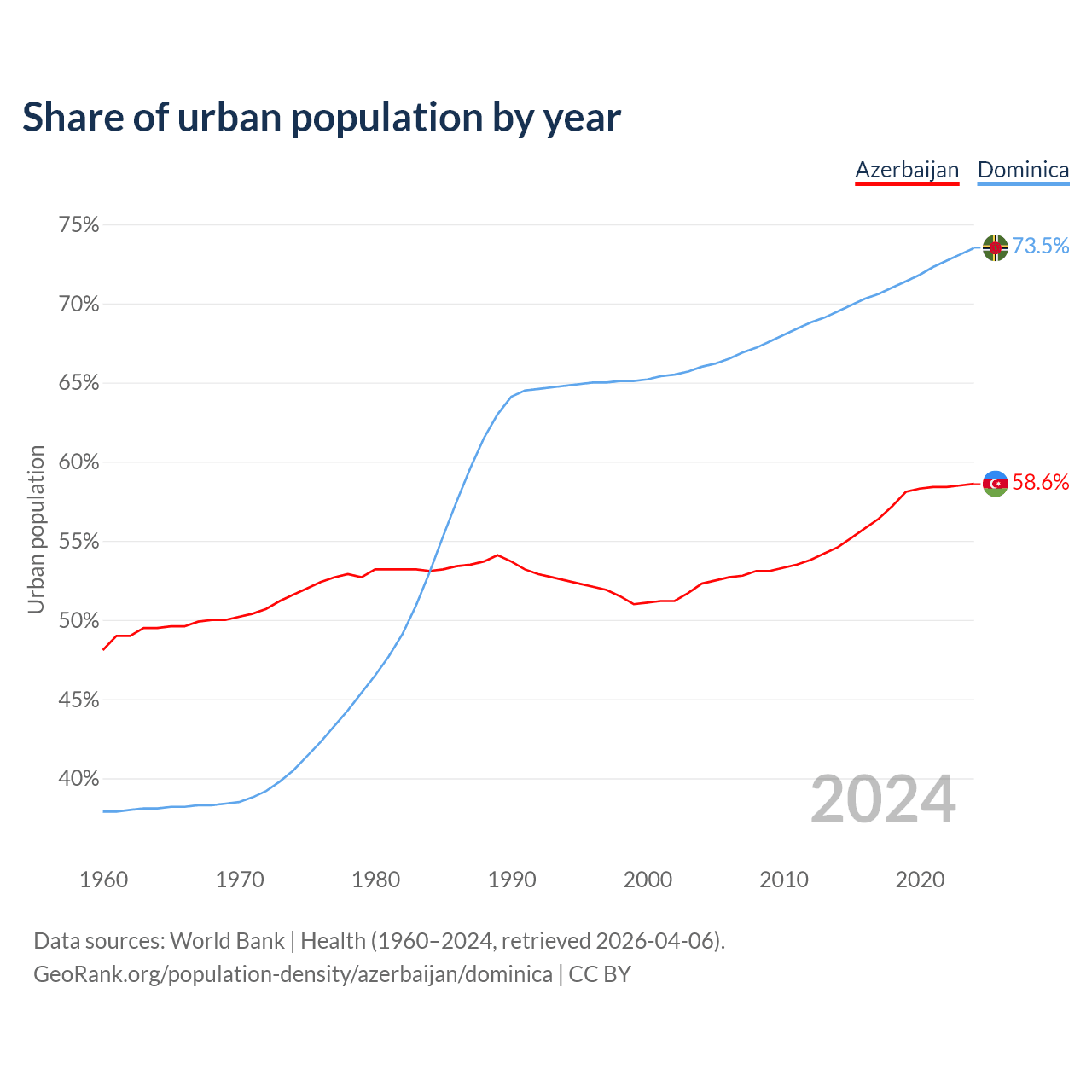 From 2004 to 2024, the share of urban population changed from 52.3% to 58.6% in Azerbaijan and from 66% to 73.5% in Dominica.