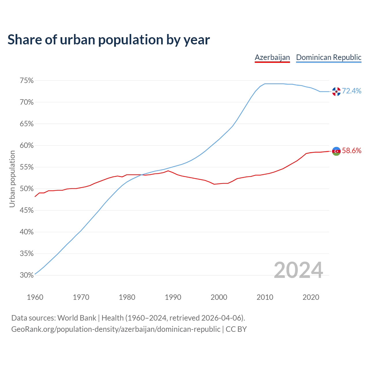 From 2004 to 2024, the share of urban population changed from 52.3% to 58.6% in Azerbaijan and from 65.9% to 72.4% in the Dominican Republic.