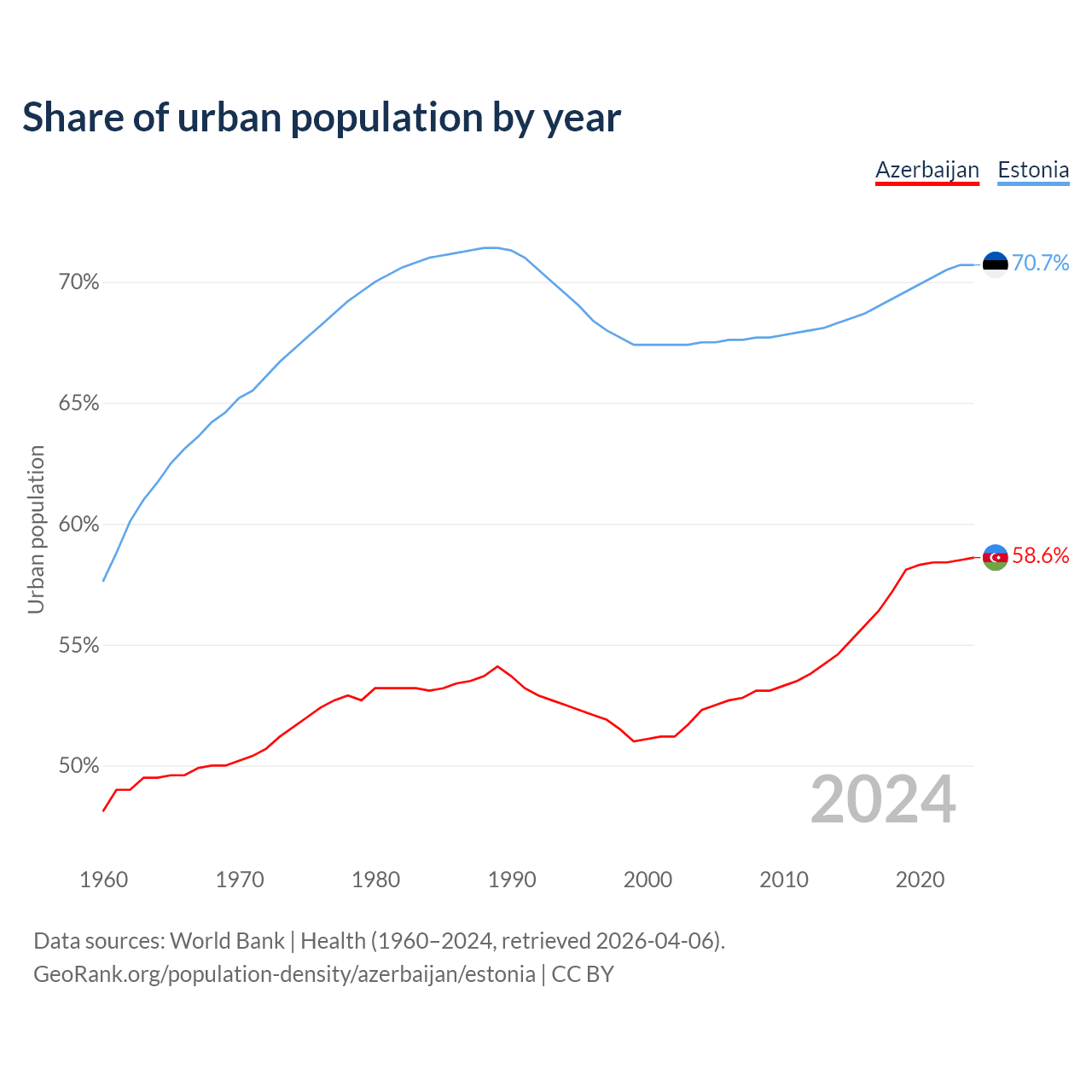 From 2004 to 2024, the share of urban population changed from 52.3% to 58.6% in Azerbaijan and from 67.5% to 70.7% in Estonia.