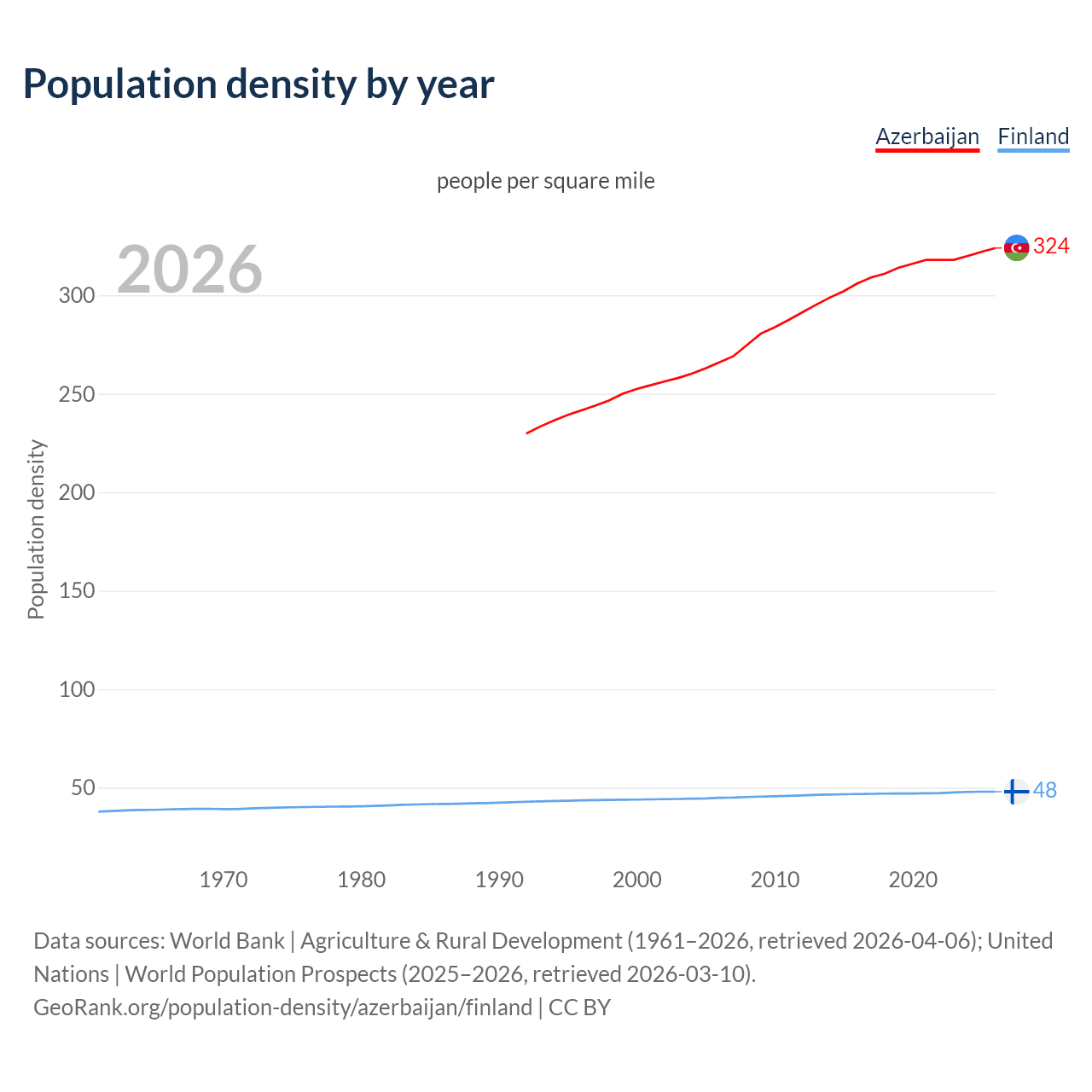 From 2006 to 2026, population density in Azerbaijan increased by 21.7%, compared to a 7% growth in Finland.