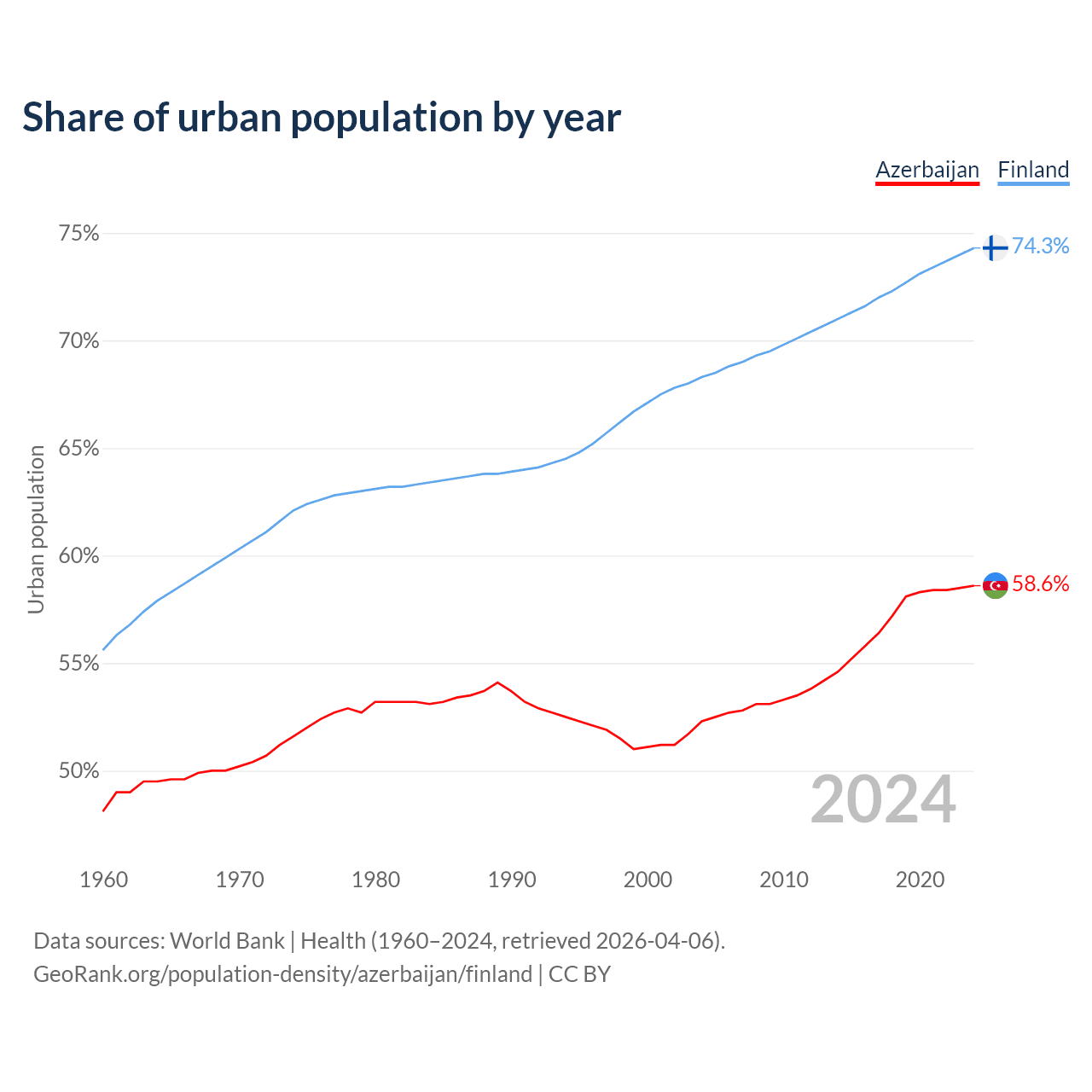 From 2004 to 2024, the share of urban population changed from 52.3% to 58.6% in Azerbaijan and from 68.3% to 74.3% in Finland.