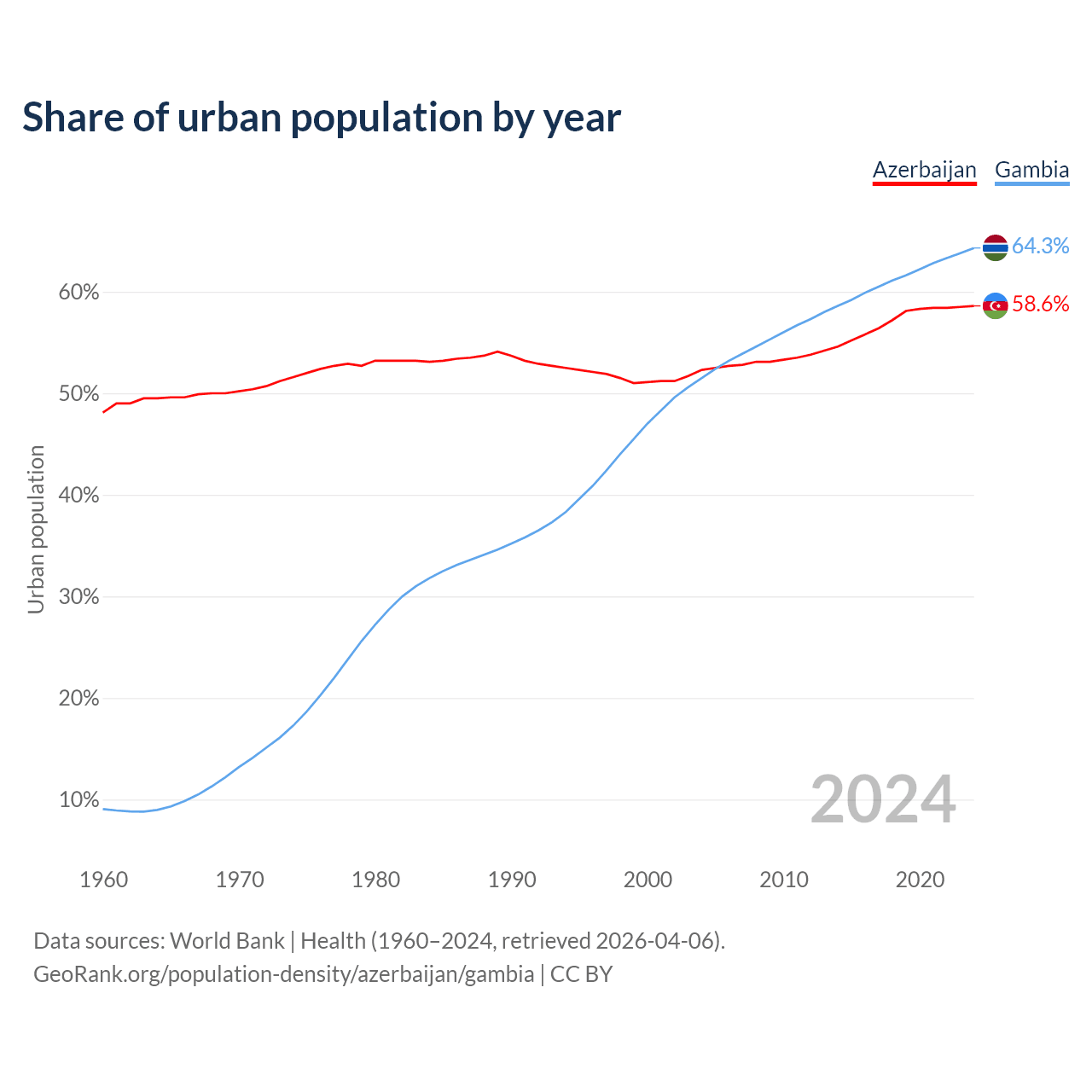 From 2004 to 2024, the share of urban population changed from 52.3% to 58.6% in Azerbaijan and from 51.5% to 64.3% in the Gambia.