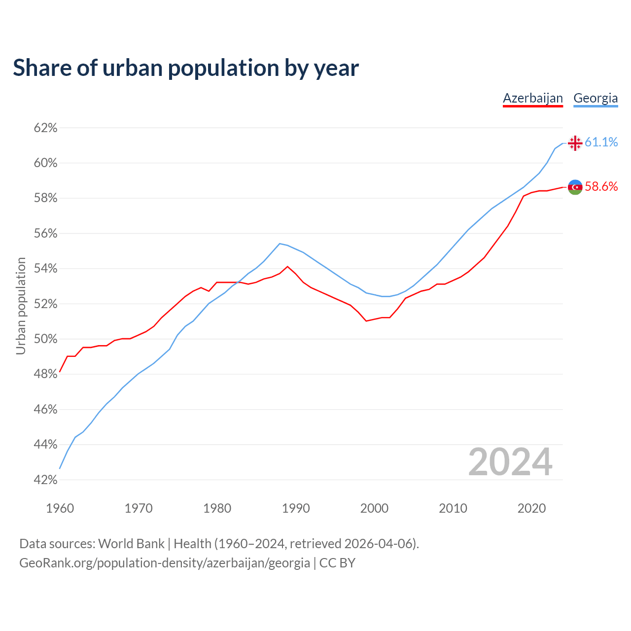 From 2004 to 2024, the share of urban population changed from 52.3% to 58.6% in Azerbaijan and from 52.7% to 61.1% in Georgia.