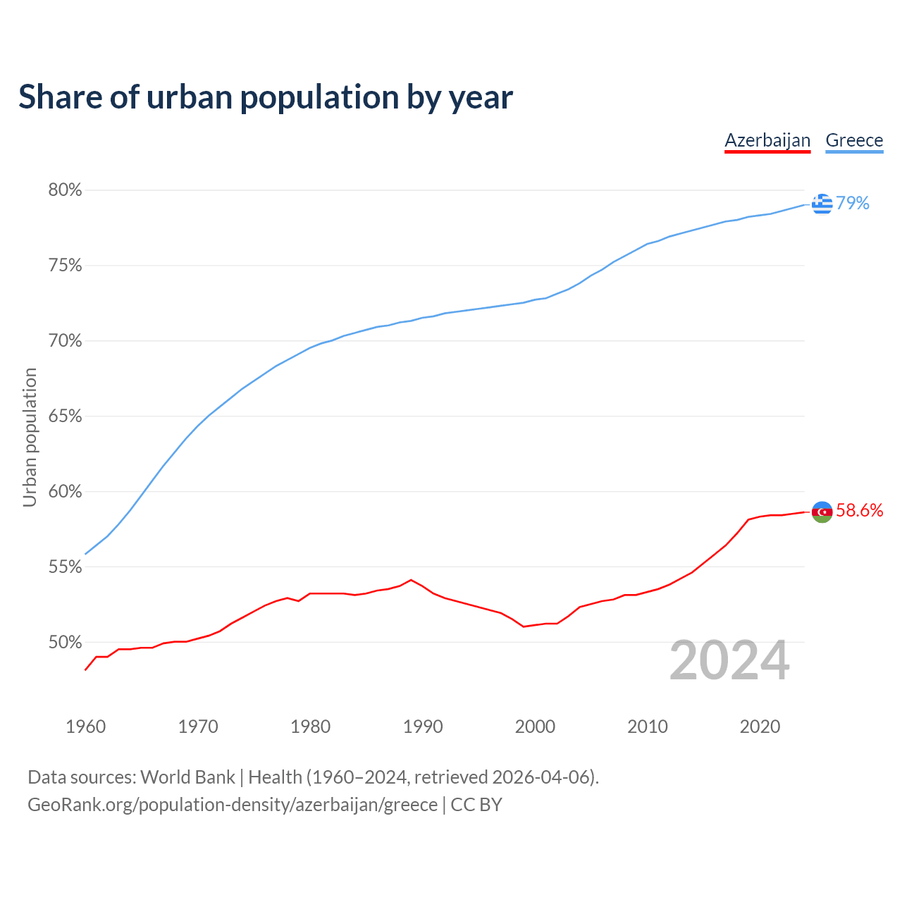 From 2004 to 2024, the share of urban population changed from 52.3% to 58.6% in Azerbaijan and from 73.8% to 79% in Greece.