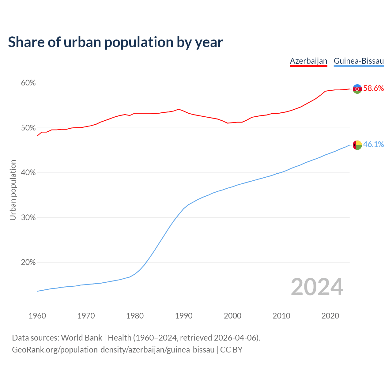 From 2004 to 2024, the share of urban population changed from 52.3% to 58.6% in Azerbaijan and from 38.1% to 46.1% in Guinea-Bissau.