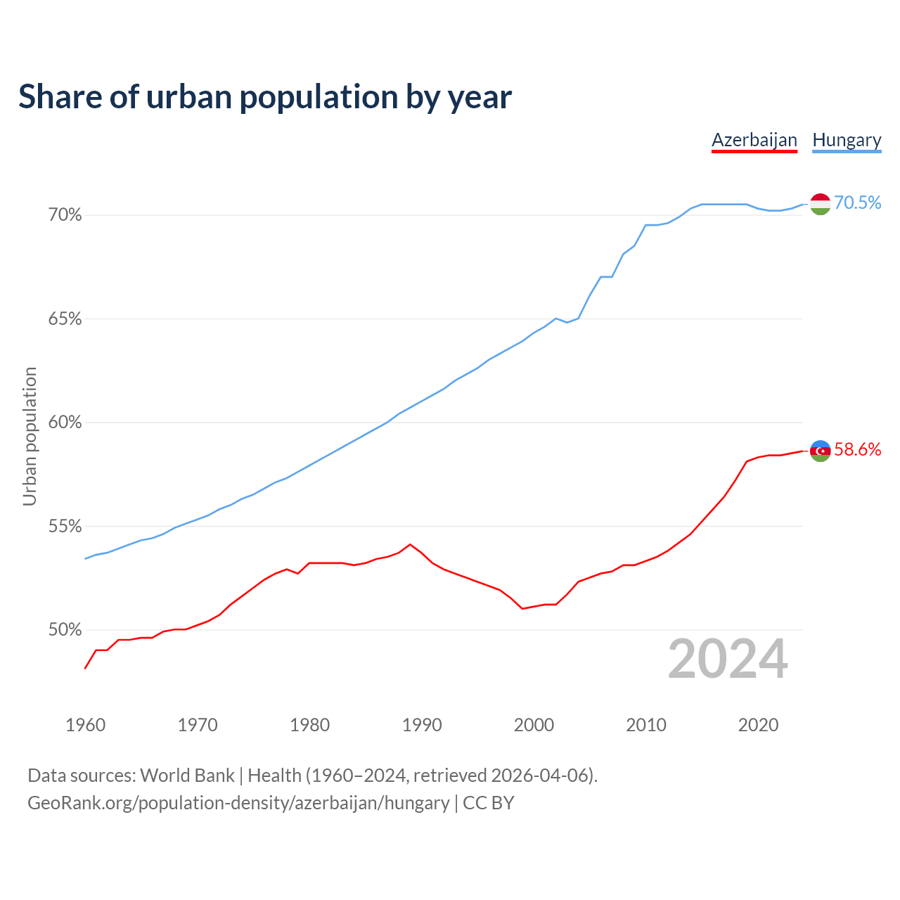 From 2004 to 2024, the share of urban population changed from 52.3% to 58.6% in Azerbaijan and from 65% to 70.5% in Hungary.