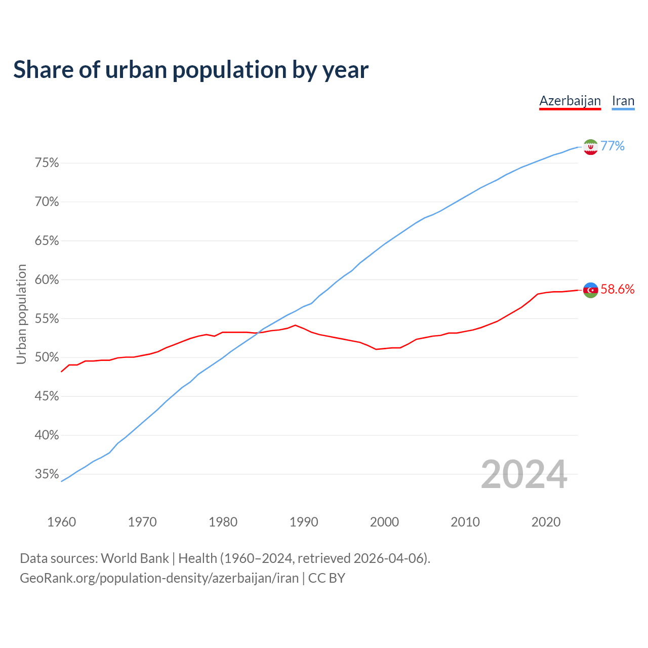 From 2004 to 2024, the share of urban population changed from 52.3% to 58.6% in Azerbaijan and from 67.3% to 77% in Iran.
