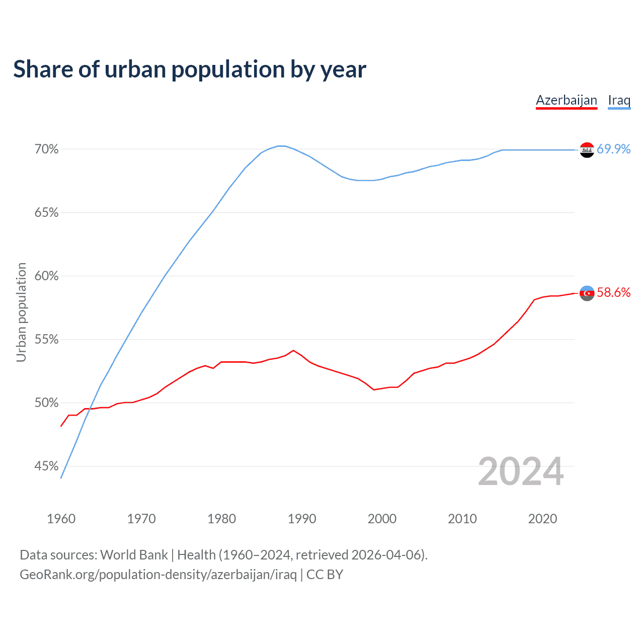 From 2004 to 2024, the share of urban population changed from 52.3% to 58.6% in Azerbaijan and from 68.2% to 69.9% in Iraq.