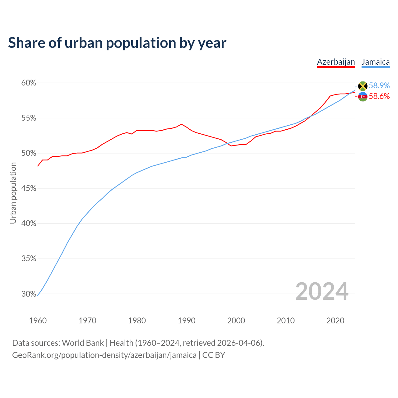 From 2004 to 2024, the share of urban population changed from 52.3% to 58.6% in Azerbaijan and from 52.6% to 58.9% in Jamaica.