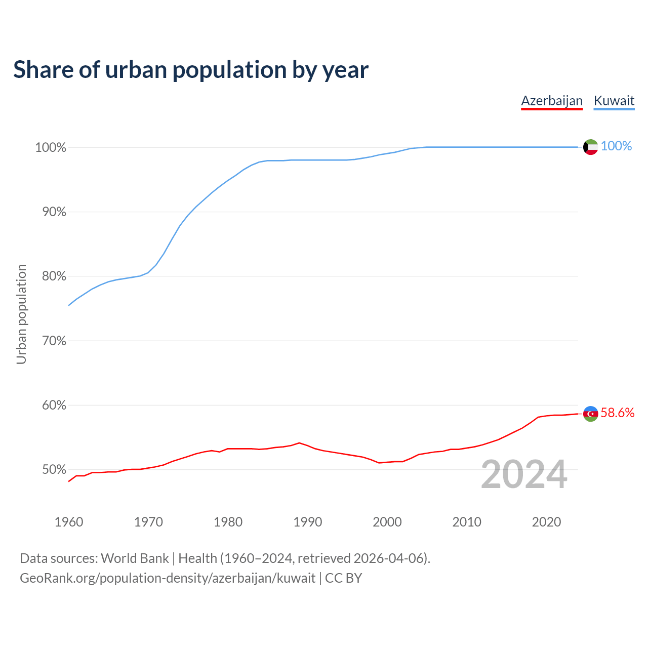 From 2004 to 2024, the share of urban population changed from 52.3% to 58.6% in Azerbaijan and from 99.9% to 100% in Kuwait.