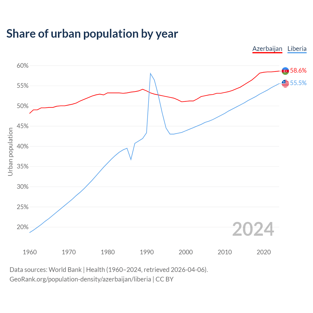 From 2004 to 2024, the share of urban population changed from 52.3% to 58.6% in Azerbaijan and from 45.4% to 55.5% in Liberia.