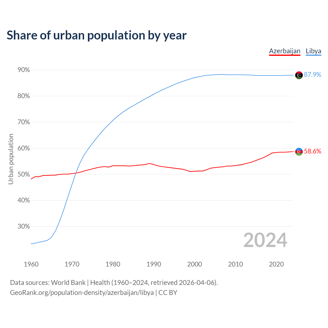 From 2006 to 2026, population density in Azerbaijan increased by 21.7%, compared to a 26% growth in Libya.