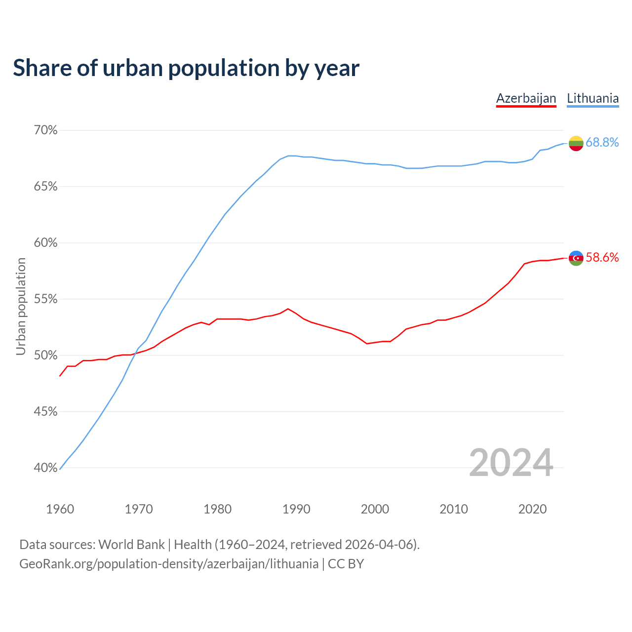 From 2004 to 2024, the share of urban population changed from 52.3% to 58.6% in Azerbaijan and from 66.6% to 68.8% in Lithuania.