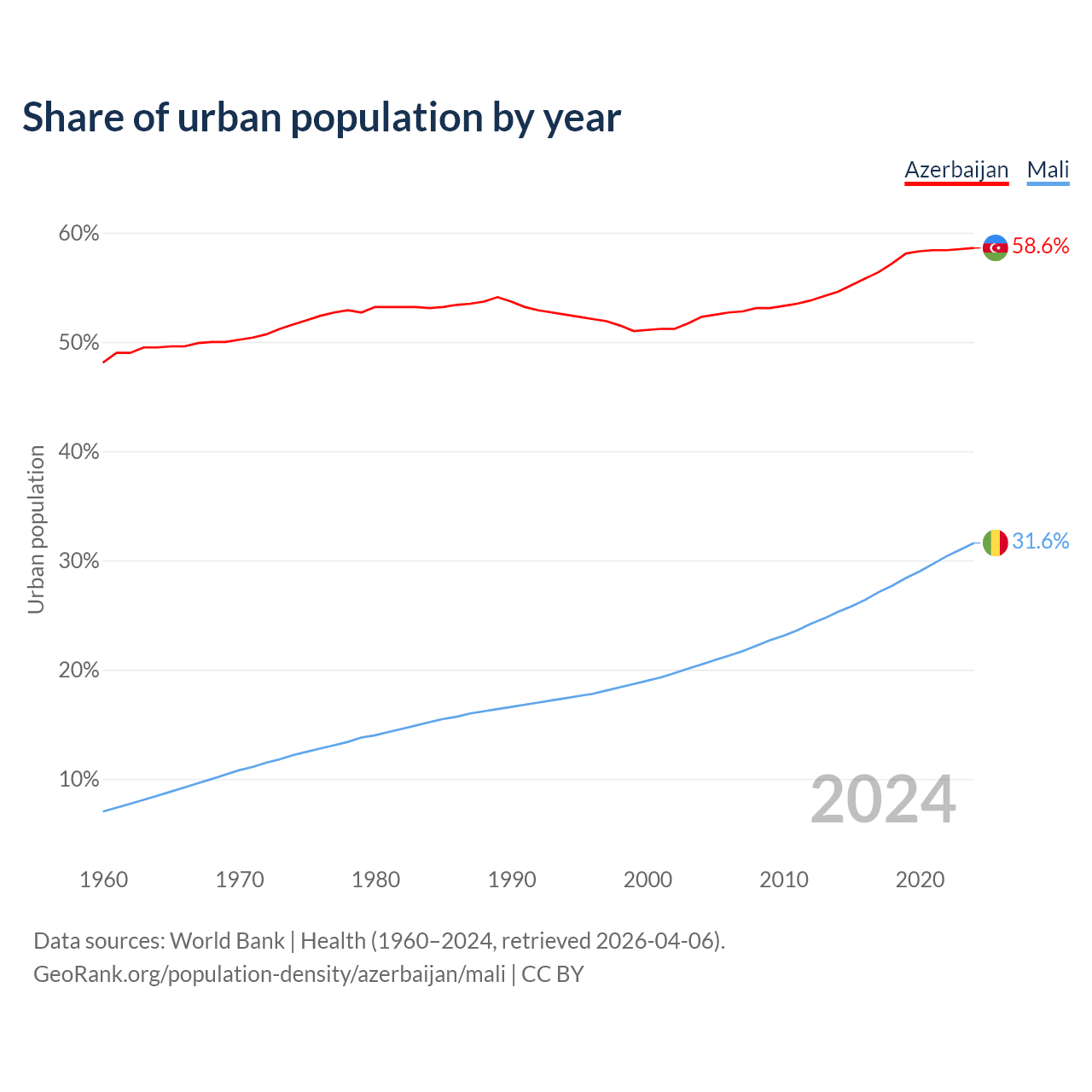 From 2004 to 2024, the share of urban population changed from 52.3% to 58.6% in Azerbaijan and from 20.5% to 31.6% in Mali.