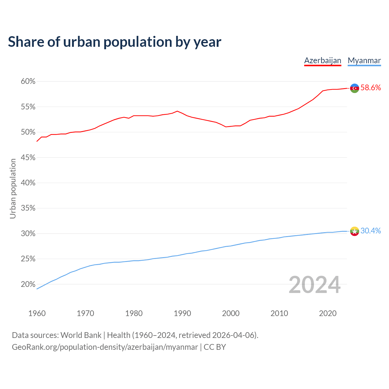 From 2004 to 2024, the share of urban population changed from 52.3% to 58.6% in Azerbaijan and from 28.2% to 30.4% in Myanmar.