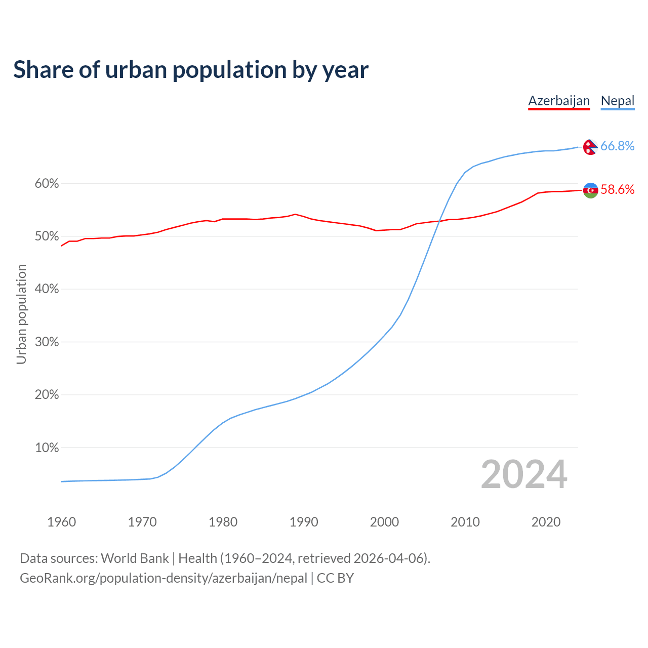 From 2004 to 2024, the share of urban population changed from 52.3% to 58.6% in Azerbaijan and from 41.6% to 66.8% in Nepal.