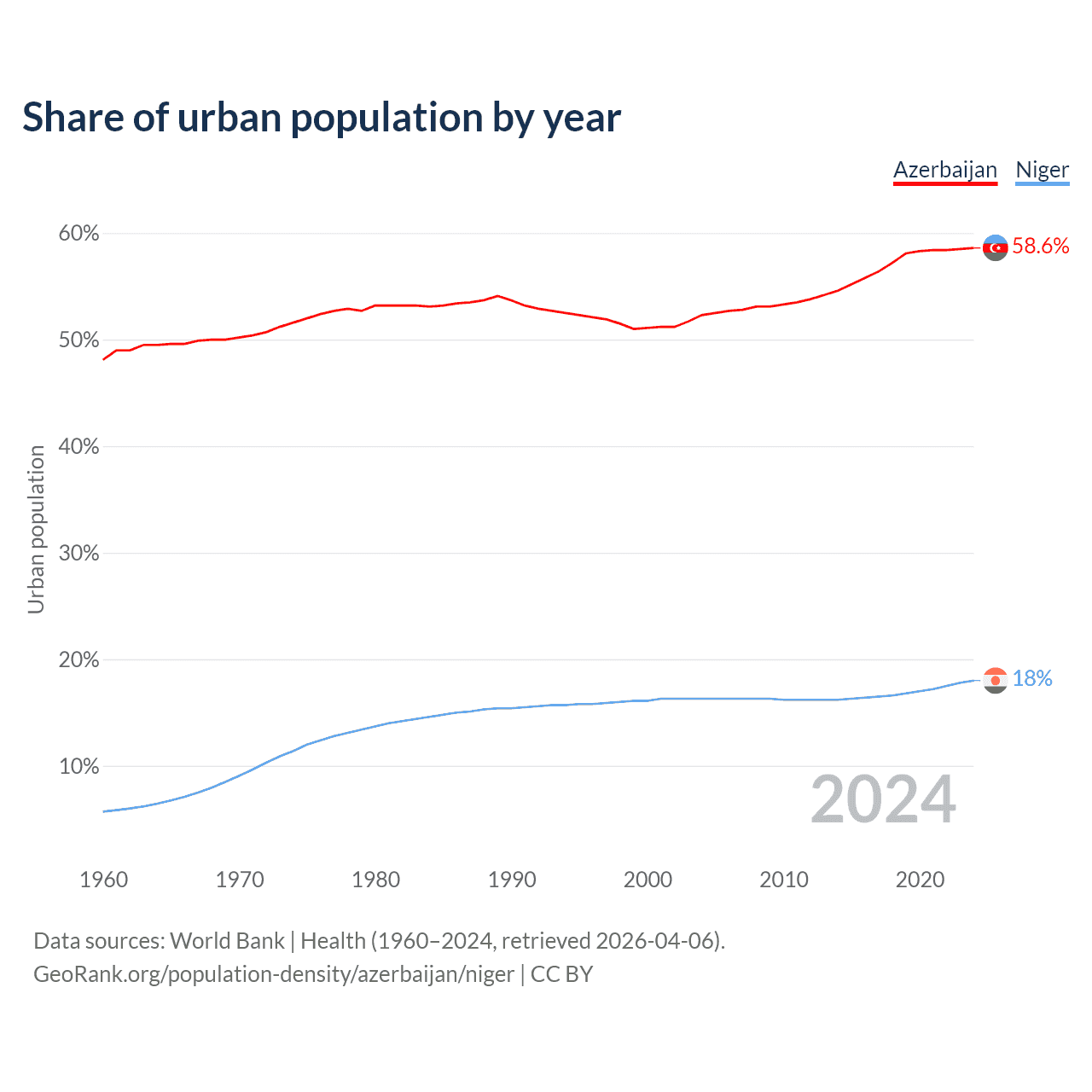 From 2004 to 2024, the share of urban population changed from 52.3% to 58.6% in Azerbaijan and from 16.3% to 18% in Niger.