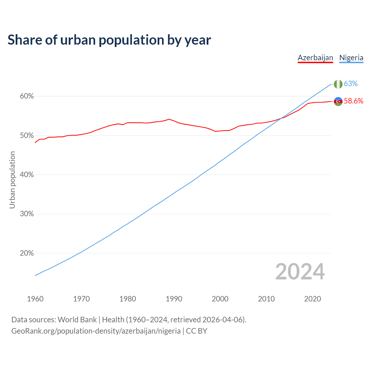 From 2004 to 2024, the share of urban population changed from 52.3% to 58.6% in Azerbaijan and from 46.7% to 63% in Nigeria.
