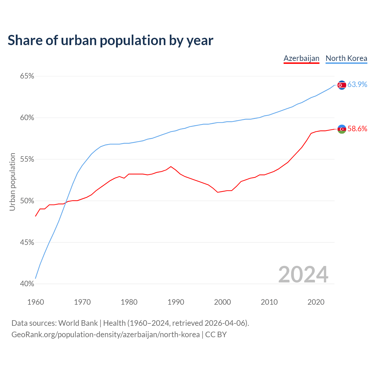 From 2004 to 2024, the share of urban population changed from 52.3% to 58.6% in Azerbaijan and from 59.7% to 63.9% in North Korea.