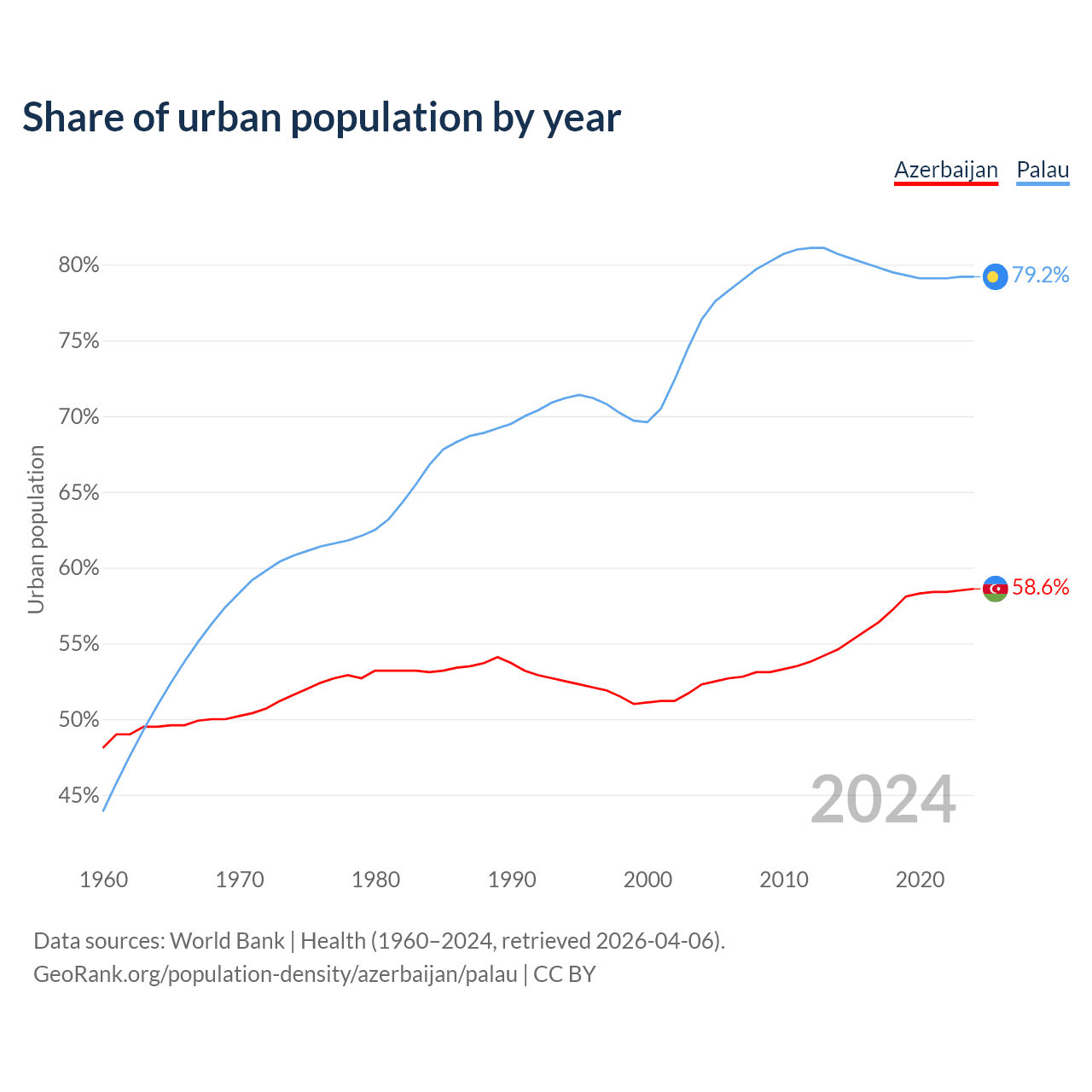 From 2004 to 2024, the share of urban population changed from 52.3% to 58.6% in Azerbaijan and from 76.4% to 79.2% in Palau.