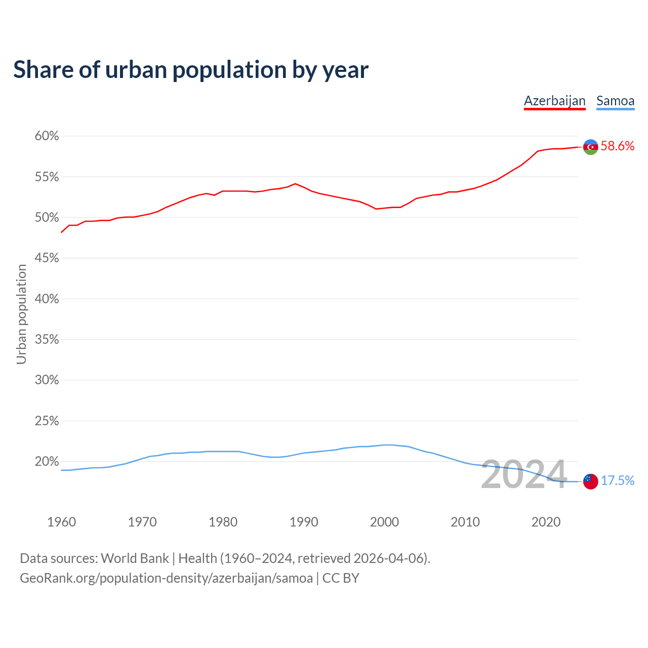 From 2004 to 2024, the share of urban population changed from 52.3% to 58.6% in Azerbaijan and from 21.5% to 17.5% in Samoa.