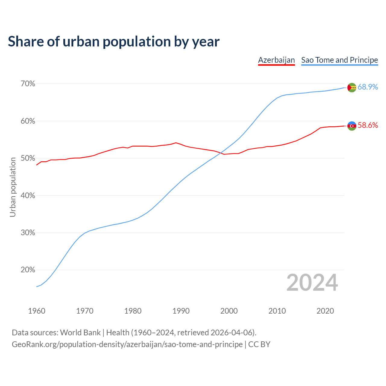 From 2004 to 2024, the share of urban population changed from 52.3% to 58.6% in Azerbaijan and from 57.9% to 68.9% in Sao Tome and Principe.