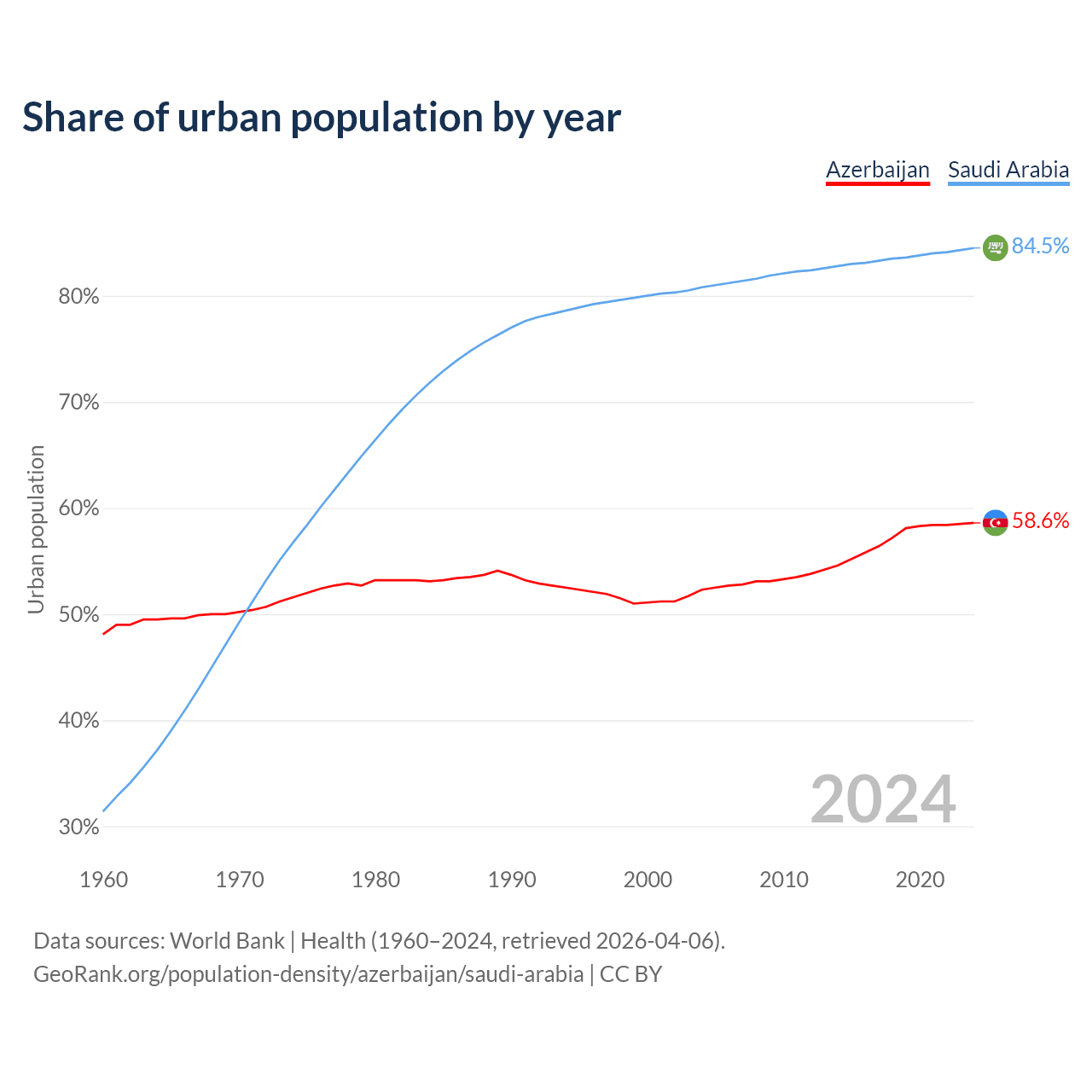 From 2004 to 2024, the share of urban population changed from 52.3% to 58.6% in Azerbaijan and from 80.8% to 84.5% in Saudi Arabia.