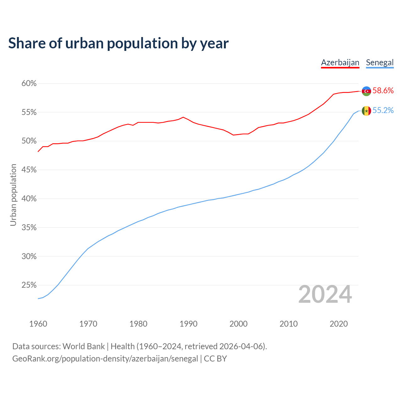From 2004 to 2024, the share of urban population changed from 52.3% to 58.6% in Azerbaijan and from 41.6% to 55.2% in Senegal.