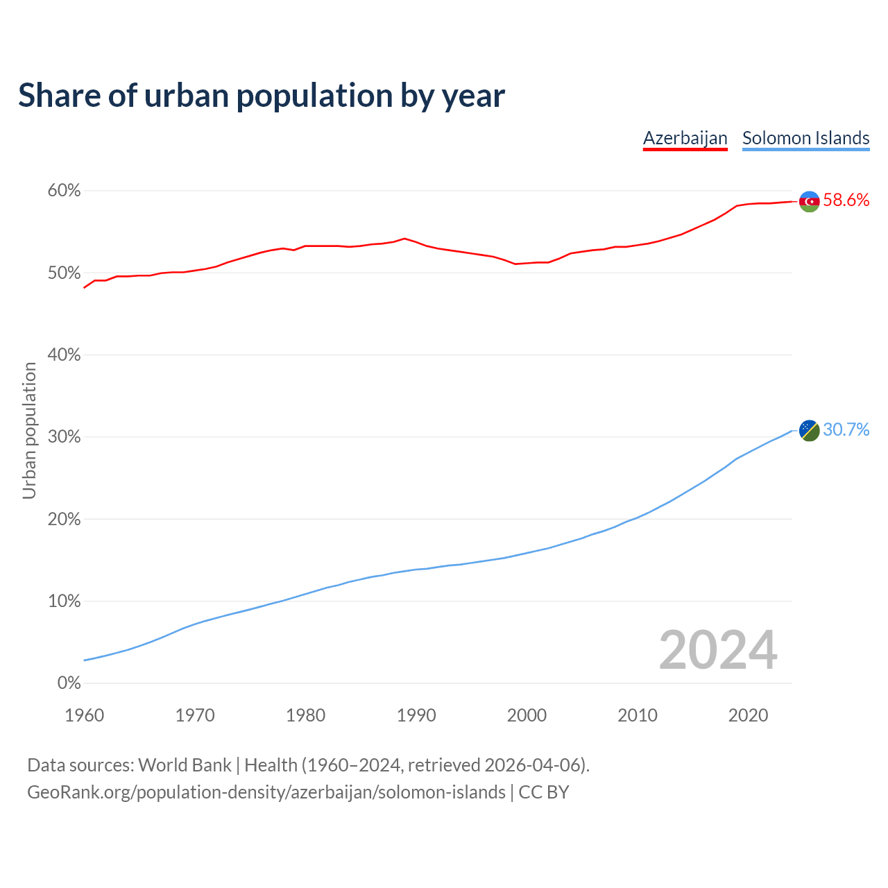 From 2004 to 2024, the share of urban population changed from 52.3% to 58.6% in Azerbaijan and from 17.2% to 30.7% in the Solomon Islands.