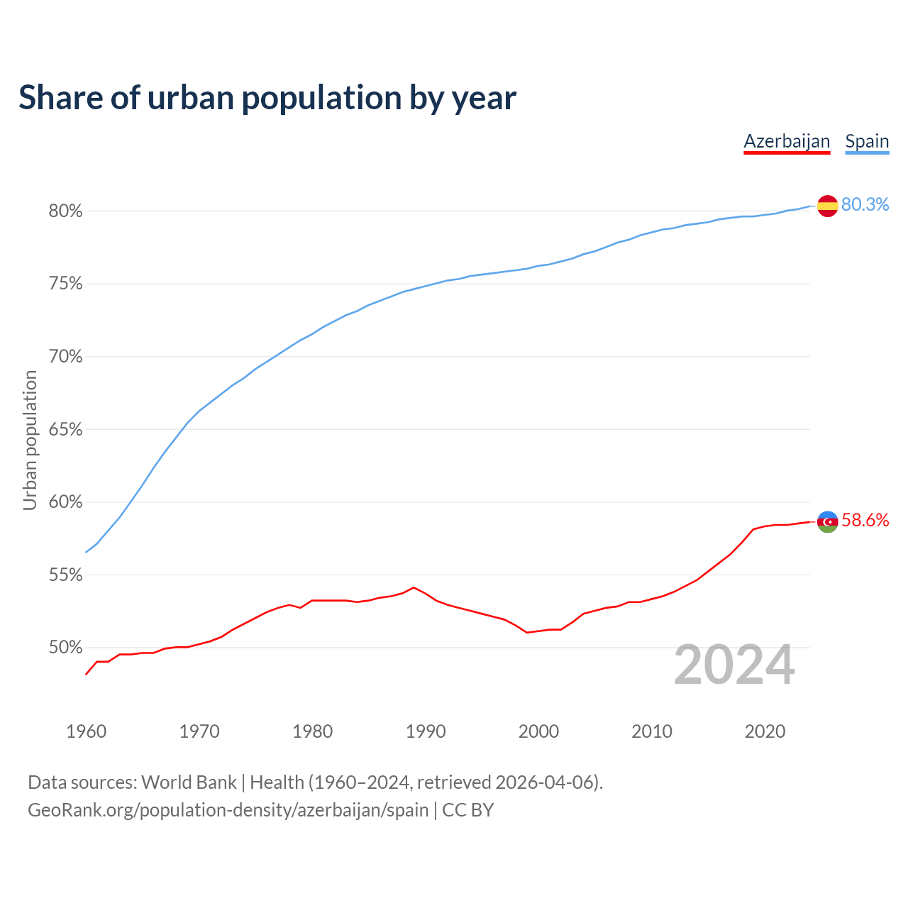 From 2004 to 2024, the share of urban population changed from 52.3% to 58.6% in Azerbaijan and from 77% to 80.3% in Spain.