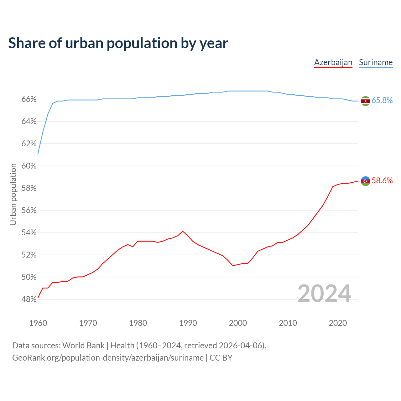 From 2004 to 2024, the share of urban population changed from 52.3% to 58.6% in Azerbaijan and from 66.7% to 65.8% in Suriname.