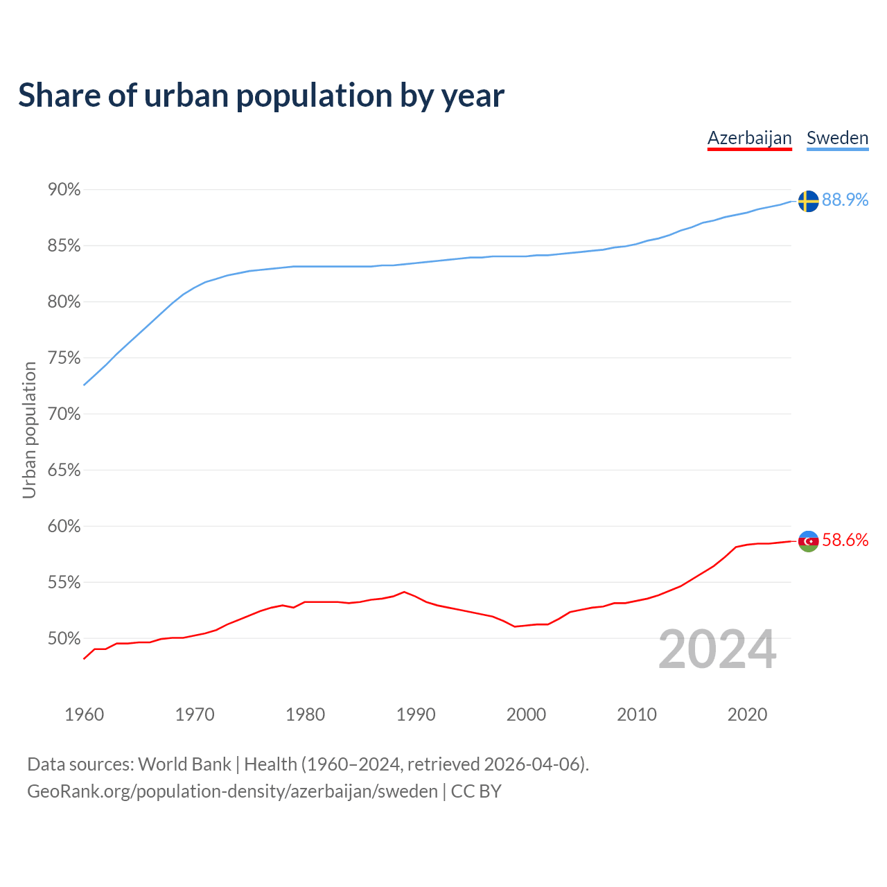 From 2004 to 2024, the share of urban population changed from 52.3% to 58.6% in Azerbaijan and from 84.3% to 88.9% in Sweden.