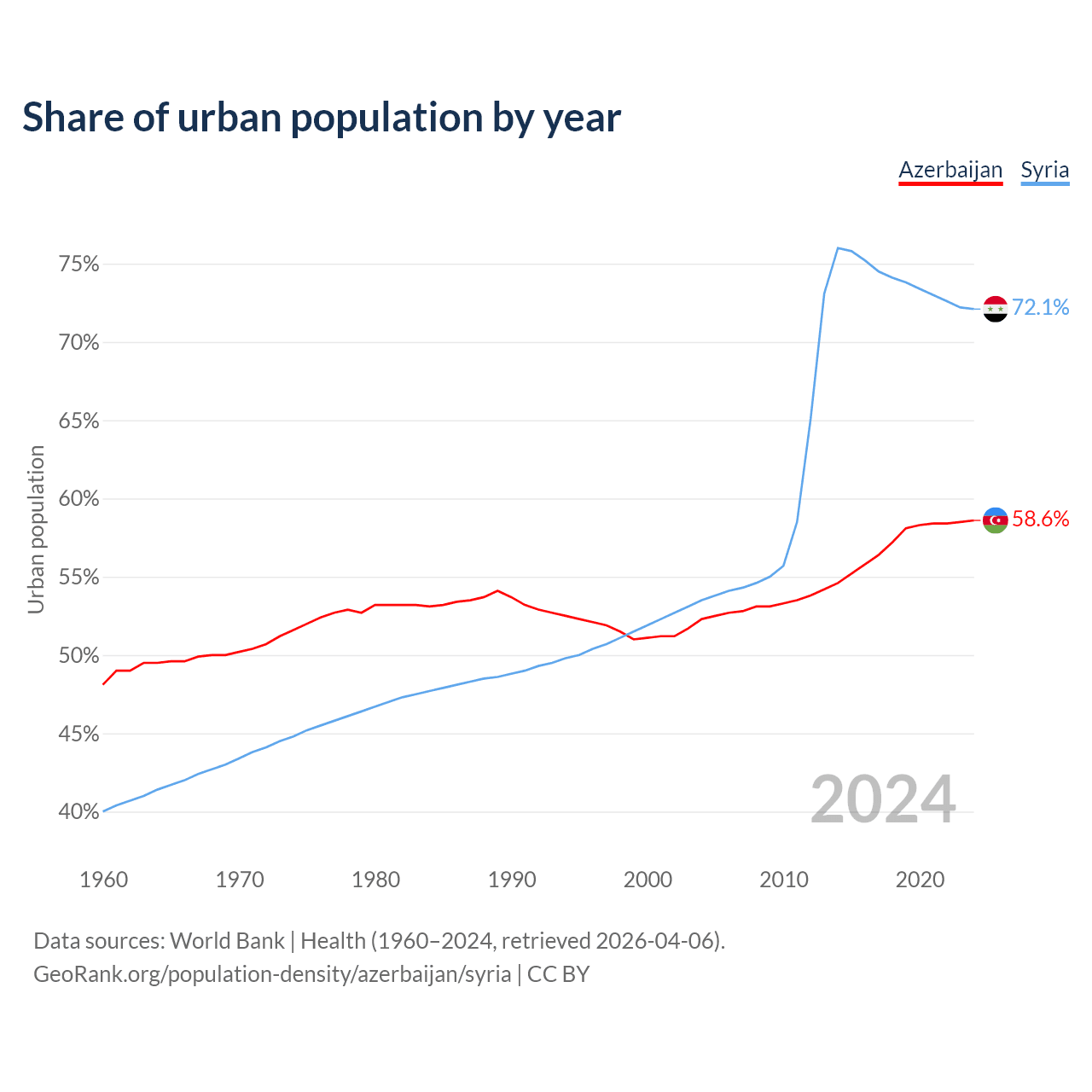 From 2004 to 2024, the share of urban population changed from 52.3% to 58.6% in Azerbaijan and from 53.5% to 72.1% in Syria.