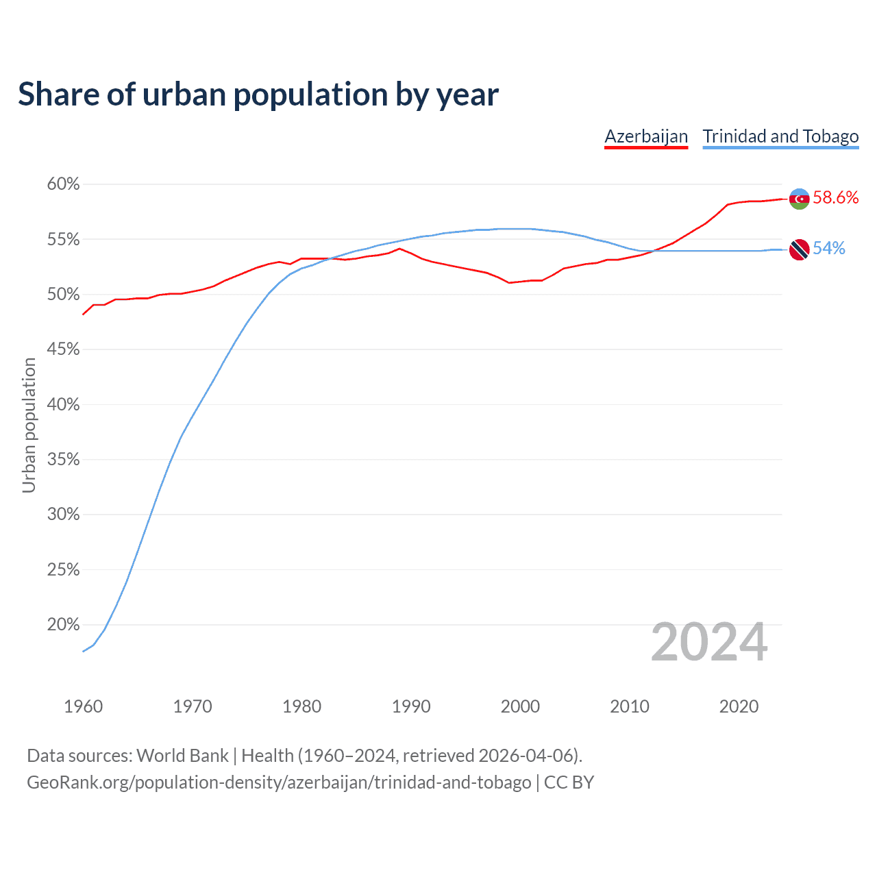 From 2004 to 2024, the share of urban population changed from 52.3% to 58.6% in Azerbaijan and from 55.6% to 54% in Trinidad and Tobago.