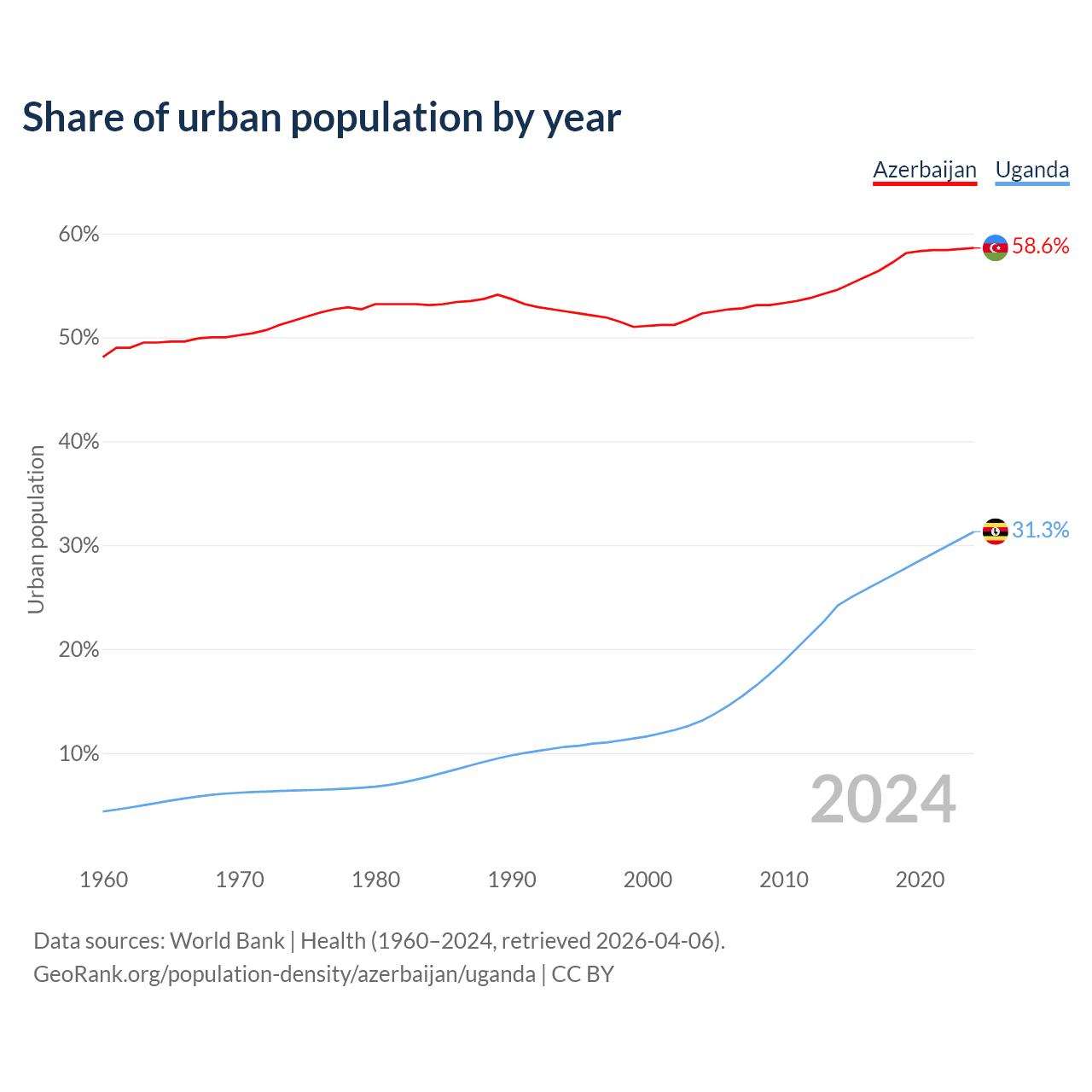 From 2004 to 2024, the share of urban population changed from 52.3% to 58.6% in Azerbaijan and from 13.1% to 31.3% in Uganda.
