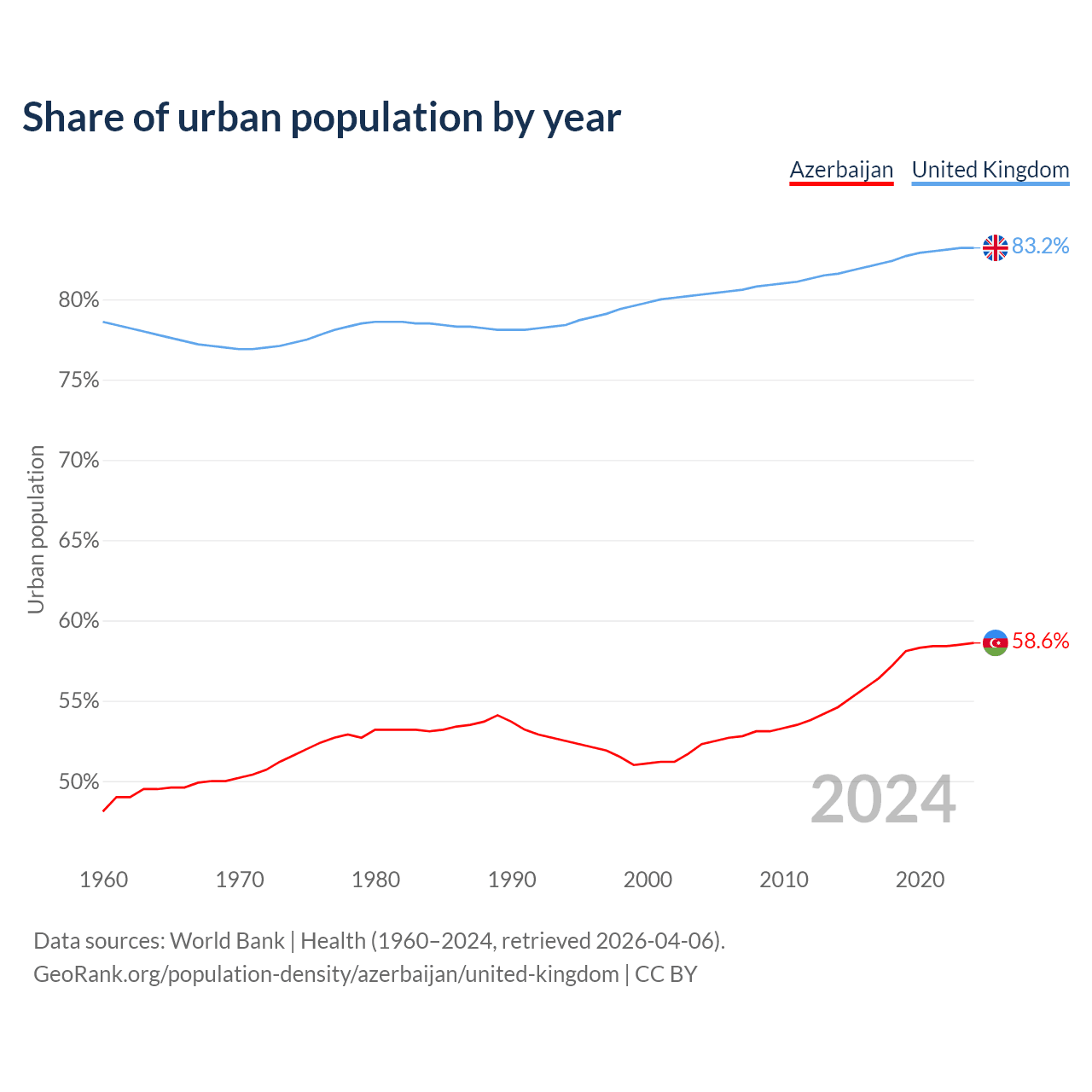 From 2004 to 2024, the share of urban population changed from 52.3% to 58.6% in Azerbaijan and from 80.3% to 83.2% in the United Kingdom.