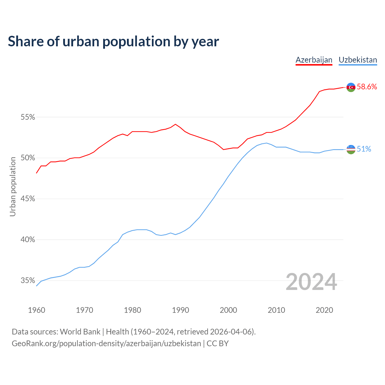 From 2004 to 2024, the share of urban population changed from 52.3% to 58.6% in Azerbaijan and from 50.6% to 51% in Uzbekistan.