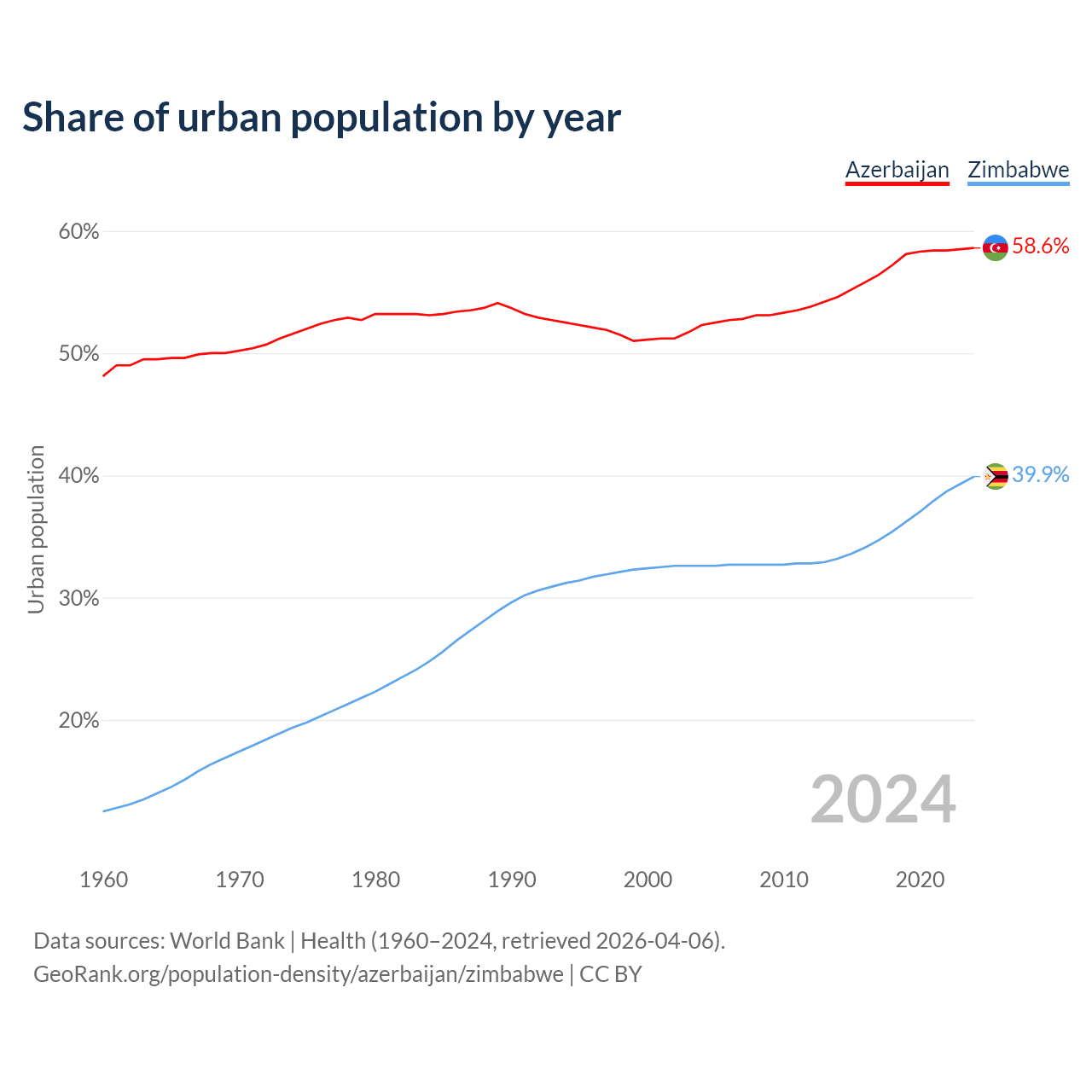 From 2004 to 2024, the share of urban population changed from 52.3% to 58.6% in Azerbaijan and from 32.6% to 39.9% in Zimbabwe.
