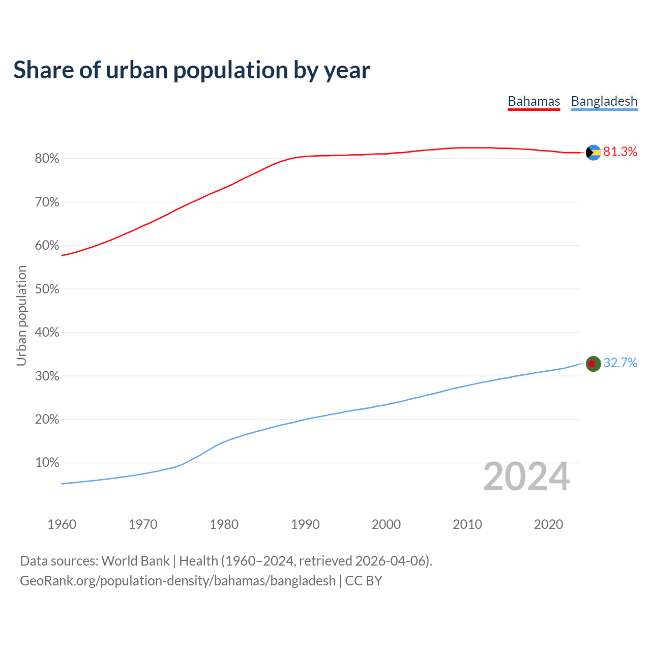 From 2004 to 2024, the share of urban population changed from 81.7% to 81.3% in the Bahamas and from 25% to 32.7% in Bangladesh.