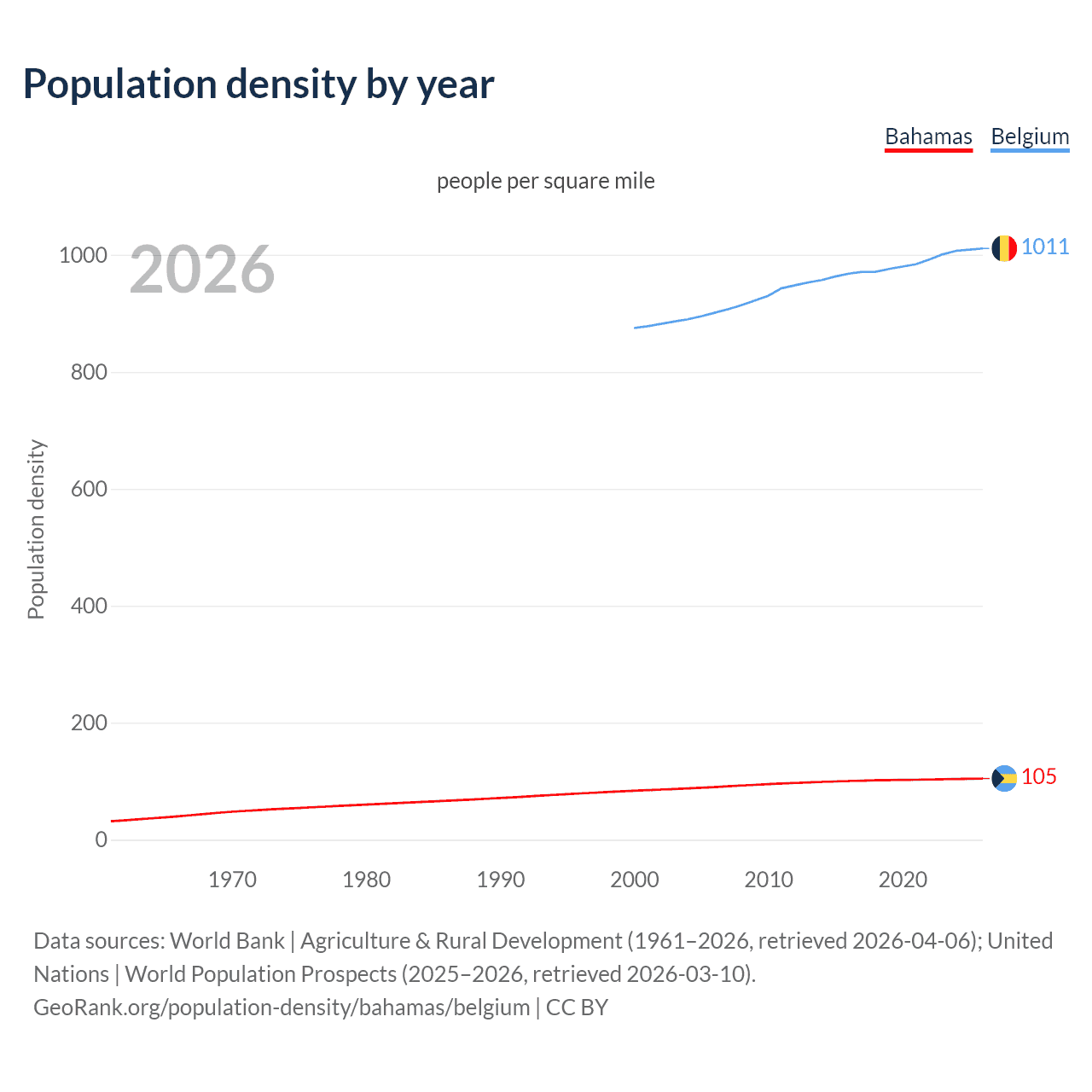 From 2006 to 2026, population density in the Bahamas increased by 16.2%, compared to a 12.2% growth in Belgium.