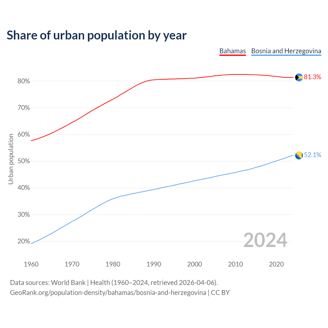From 2004 to 2024, the share of urban population changed from 81.7% to 81.3% in the Bahamas and from 43.8% to 52.1% in Bosnia and Herzegovina.