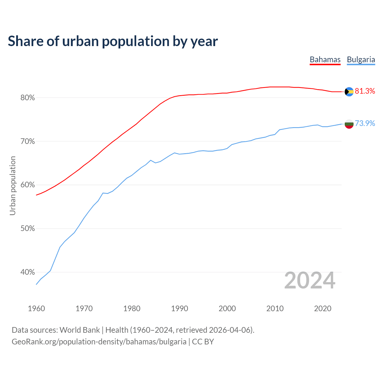 From 2004 to 2024, the share of urban population changed from 81.7% to 81.3% in the Bahamas and from 69.9% to 73.9% in Bulgaria.