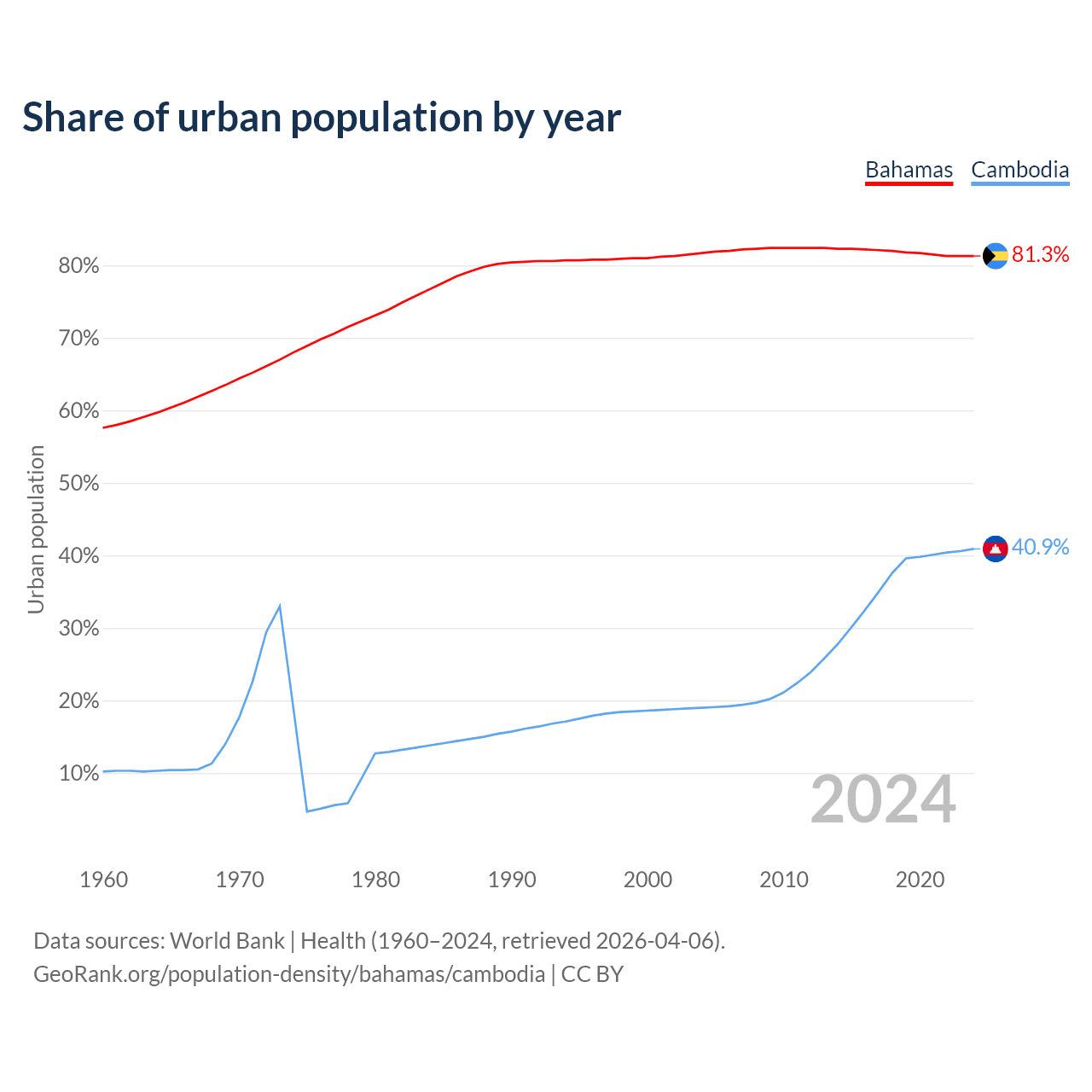 From 2004 to 2024, the share of urban population changed from 81.7% to 81.3% in the Bahamas and from 19% to 40.9% in Cambodia.