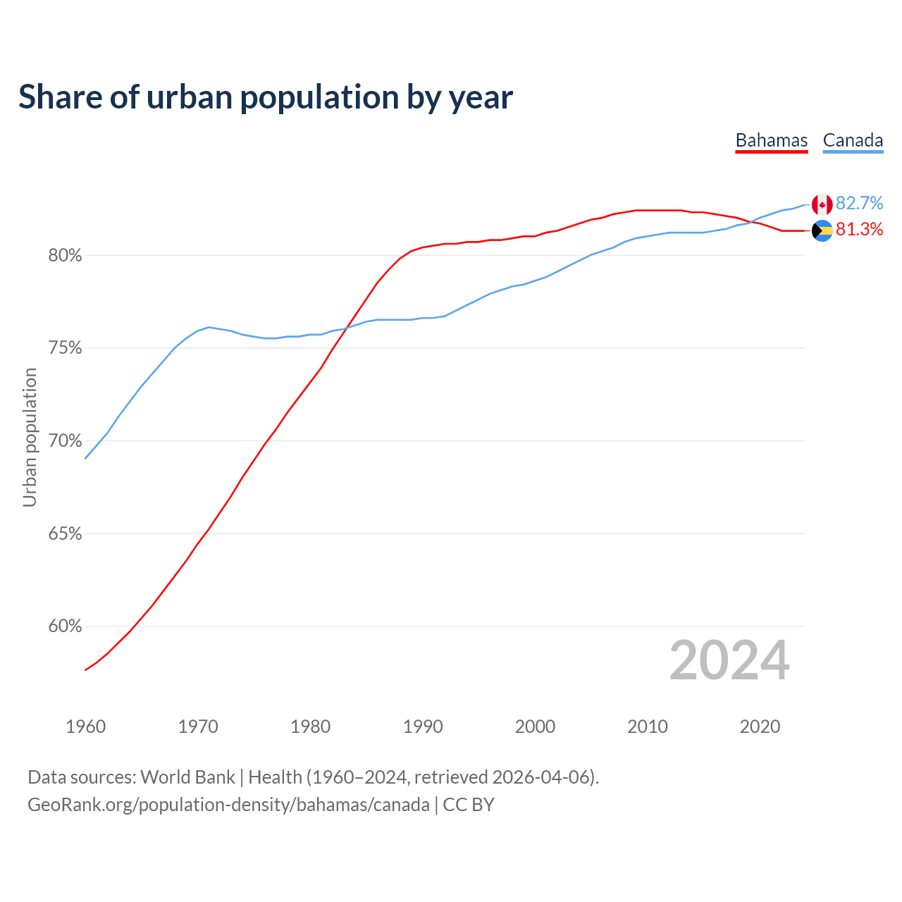 From 2004 to 2024, the share of urban population changed from 81.7% to 81.3% in the Bahamas and from 79.7% to 82.7% in Canada.